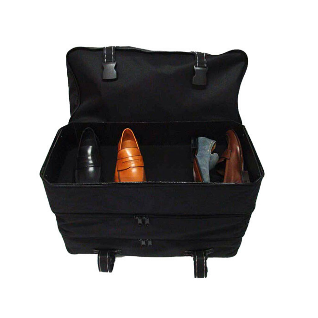 24 Mens shoe/footwear sample bag with 4 tiers, a lightweight and durable shoe sample transit, storage and presentation solution. Perfect for travelling footwear reps presentation or demonstration purposes, the 6820 mens shoe sample bag will hold up to 6 mens shoes per tier. The top compartment of the 6820 mens shoe sample bag features a central zip closure and the 3 lower sections zip around 3 sides to allow the tiers above to be fold back to allow viewing the lower sample tray.