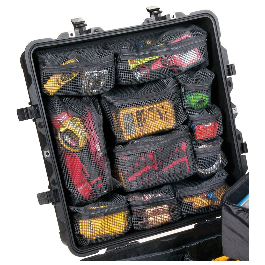 A lid organiser will allow you to utilise all of the storage space available within the lid of your Peli 0370. The ideal storage solution for cables, stationary and small accessories, lid organisers are perfect for ensuring smaller items are easily located within your Peli 0370 case. Lid organisers are supplied with the necessary screws to be fitted securely via the moulded recesses into the lid section of the case. Should you have an existing older model of the Peli 0370 case then these will not be present. One way many people use to hold the lid organiser in place…