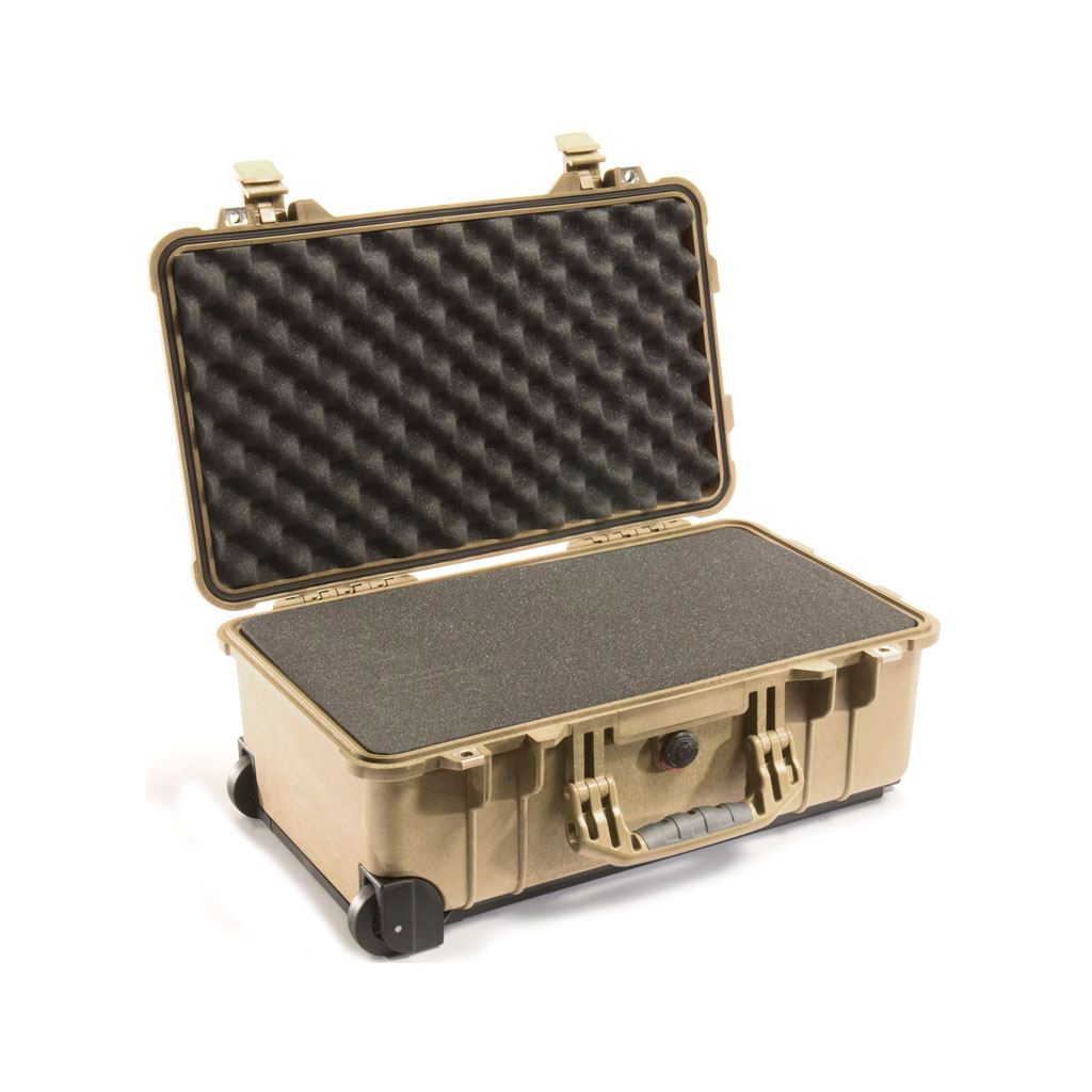 Peli 1510 watertight protective case on wheels is the most popular Peli medium sized case.  This Peli case complies with most airlines carry-on luggage sizes (check with your airline to be certain of size restrictions) and is ideal to be either taken on board and aircraft or is strong enough to be checked into the hold.  Pull along by using the telescopic handle and wheels or carry by hand this lightweight yet extremely strong case.  The 1510  Peli case is perfect for offering protection to items in storage or transit.  Sensitive, fragile or valuable equipment such as measuring instruments, tools, medical equipment or electronic devices are all commonly transported within Peli cases as they are watertight, crush resistant and dustproof.  The Peli 1510 cases comes supplied with the Peli lifetime manufacturers guarantee.