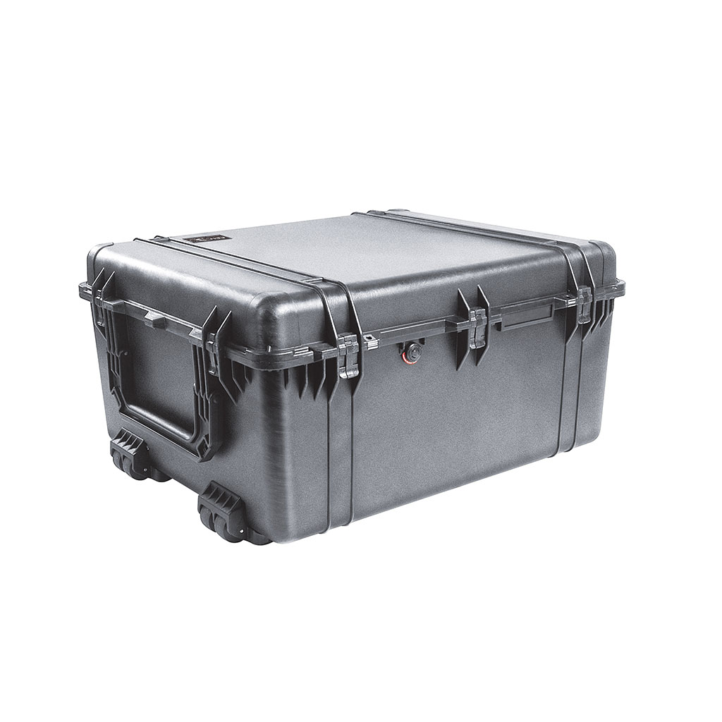 Peli 1690 watertight protective case with wheels is a large sized case and features two fold down handles for twin two man hand lift and 4 strong wheels and pull along folding handle. This lightweight yet extremely strong hardsided case is an ideal transport case and offers total protection to items in storage or transit. Sensitive, fragile or valuable equipment such as measuring instruments, tools, medical equipment or electronic devices are all commonly transported safely within Peli cases. Waterproof, crush resistant, dustproof the Peli 1690 cases comes supplied with the Peli lifetime manufacturers guarantee.
