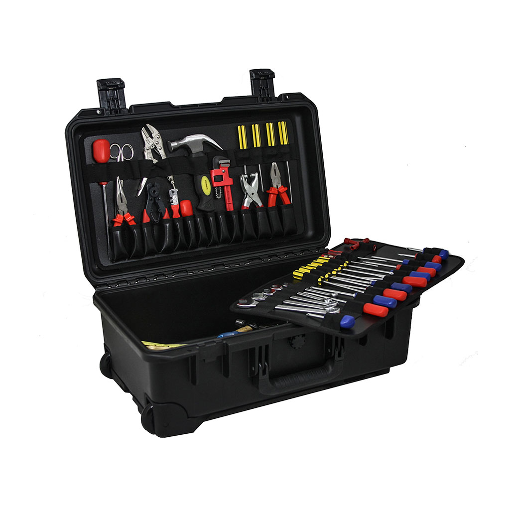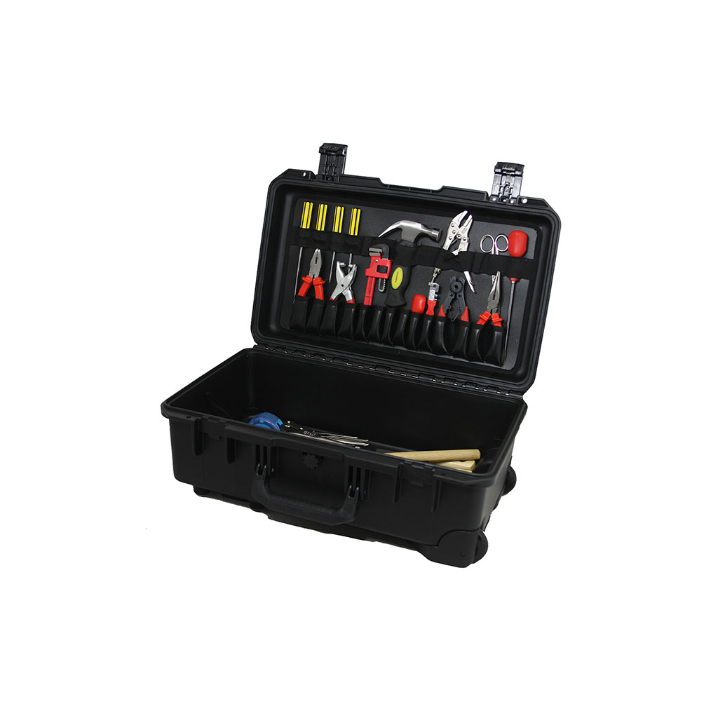 Heavy duty tool case with wheels, converted using a iM2500 from the Peli Storm range to offer a super strong protective tool case on wheels. The iM2500 Peli Storm Tool Case has the same legendary qualities as the Peli Protector Case range. Fitted with two press & pull latches which open with a light touch, a soft grip folding carry handle and two padlock hasps plus telescopic handle and wheels which allow you to securely store and easily transport all of your tools. Made in lightweight, strong HPX resin the iM2500 tool case with wheels will protect your tools in the harshest of environments and is waterproof, dustproof and crushproof.